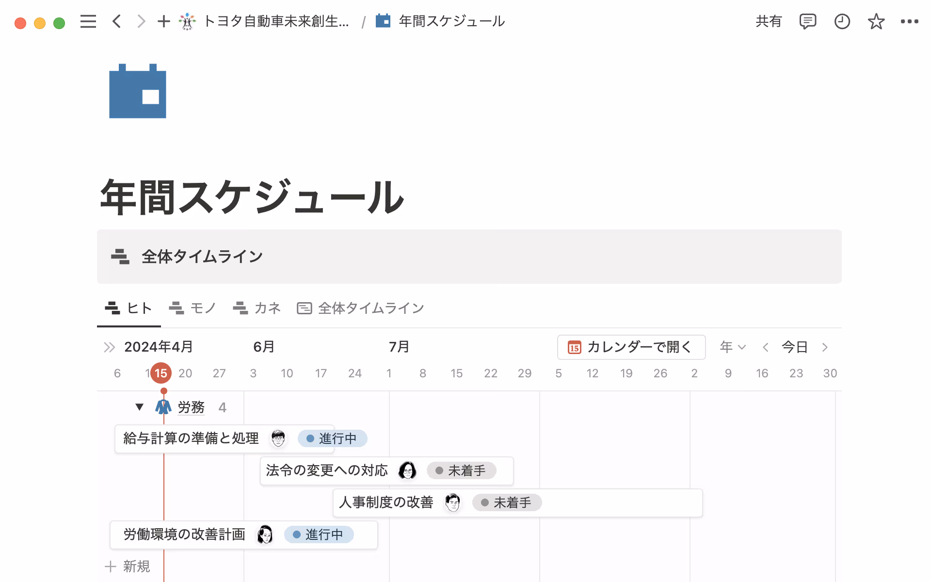 チームの年間スケジュールのような流動的な情報の管理にもNotionを活用しています。トヨタ未来創生センターの管理部門では、いままで表計算ソフトで年間予算計画を作成・管理していましたが、作成者に依存した運用になっていたため常に最新の情報を更新することが難しい状況でした。また、足りない情報はプレゼンテーションソフトで補うといった情報とツールの混在に加え、上長や担当者の異動の際の引き継ぎにも課題を抱えていました。