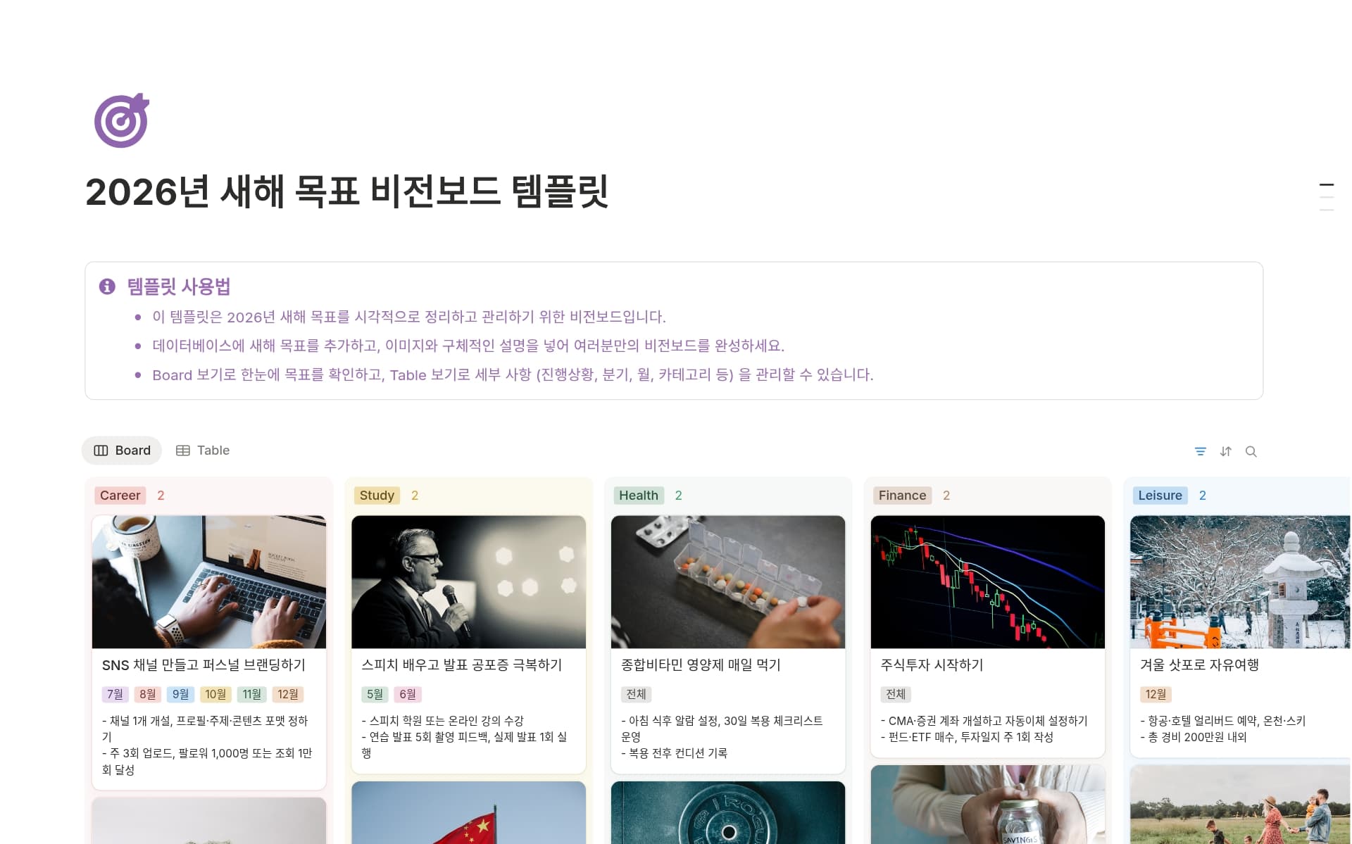 처음 노션 쓰는데 P도 쉽게 부담 없이 짤 수 있어서 좋아요. 2026년 계획 없이 살려다가 한번 시도해보았는데 재밌어요. 사진 넣고 꾸미는 것도 더 구체화 되는 듯하고, 예시 목표가 써있어서 저도 예를들어 적을 수 있어서 좋아요.