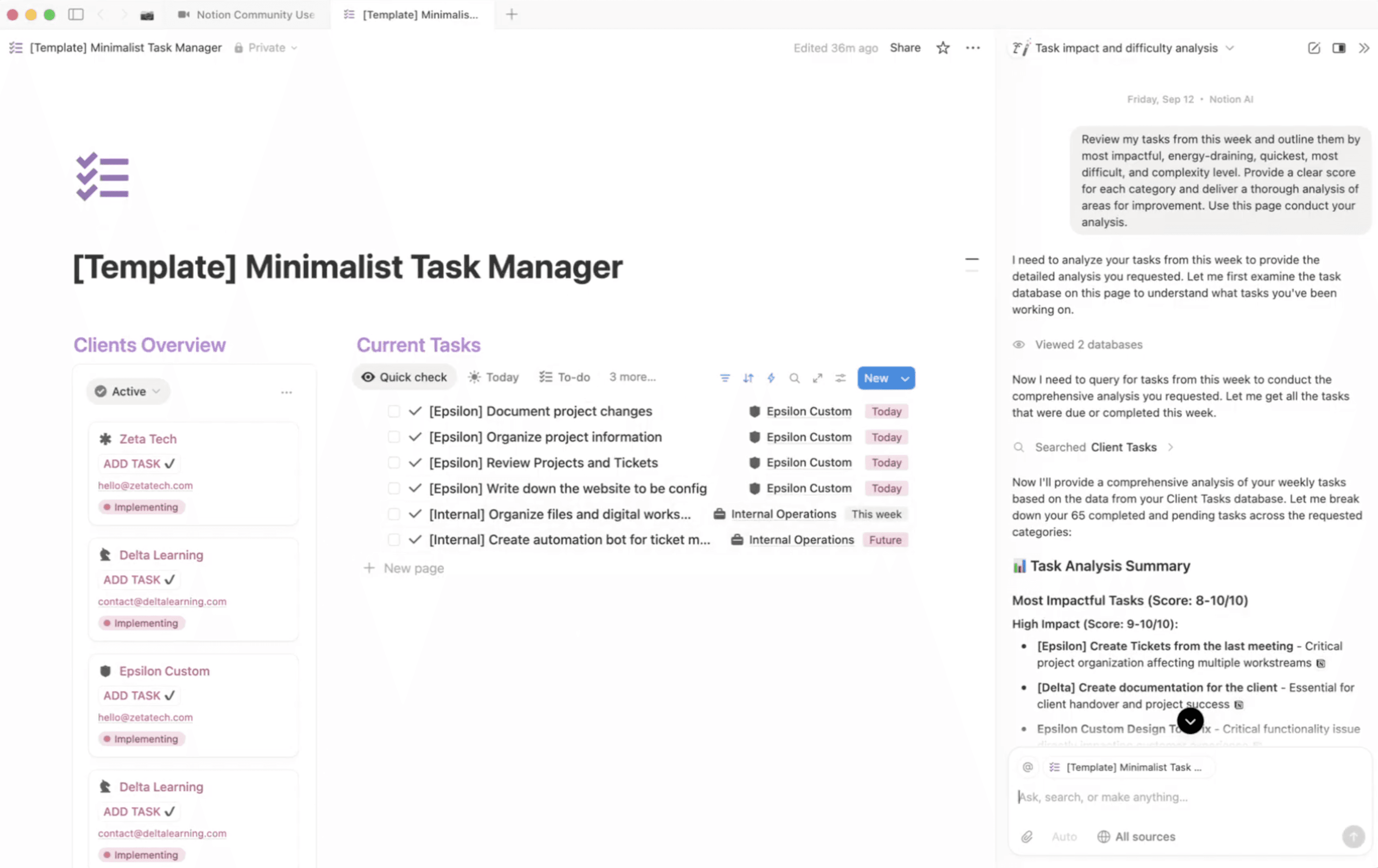 Let’s plan for the coming month using @Mode 1 (Essentialist Productivity Coach & Personal Assistant). By looking at my task database & projects database, emails, and meeting notes please do the following: - Assess & report: what should I focus on? What should I avoid? Why? - Identify the quick wins and deep work that will have the biggest impact for the month - Set a key goal for the month - Make a plan for the coming week - Set a task list ready for tomorrow and time block my day (you can then create or move relevant tasks in the tasks database to tomorrow and set their urgency and importance).