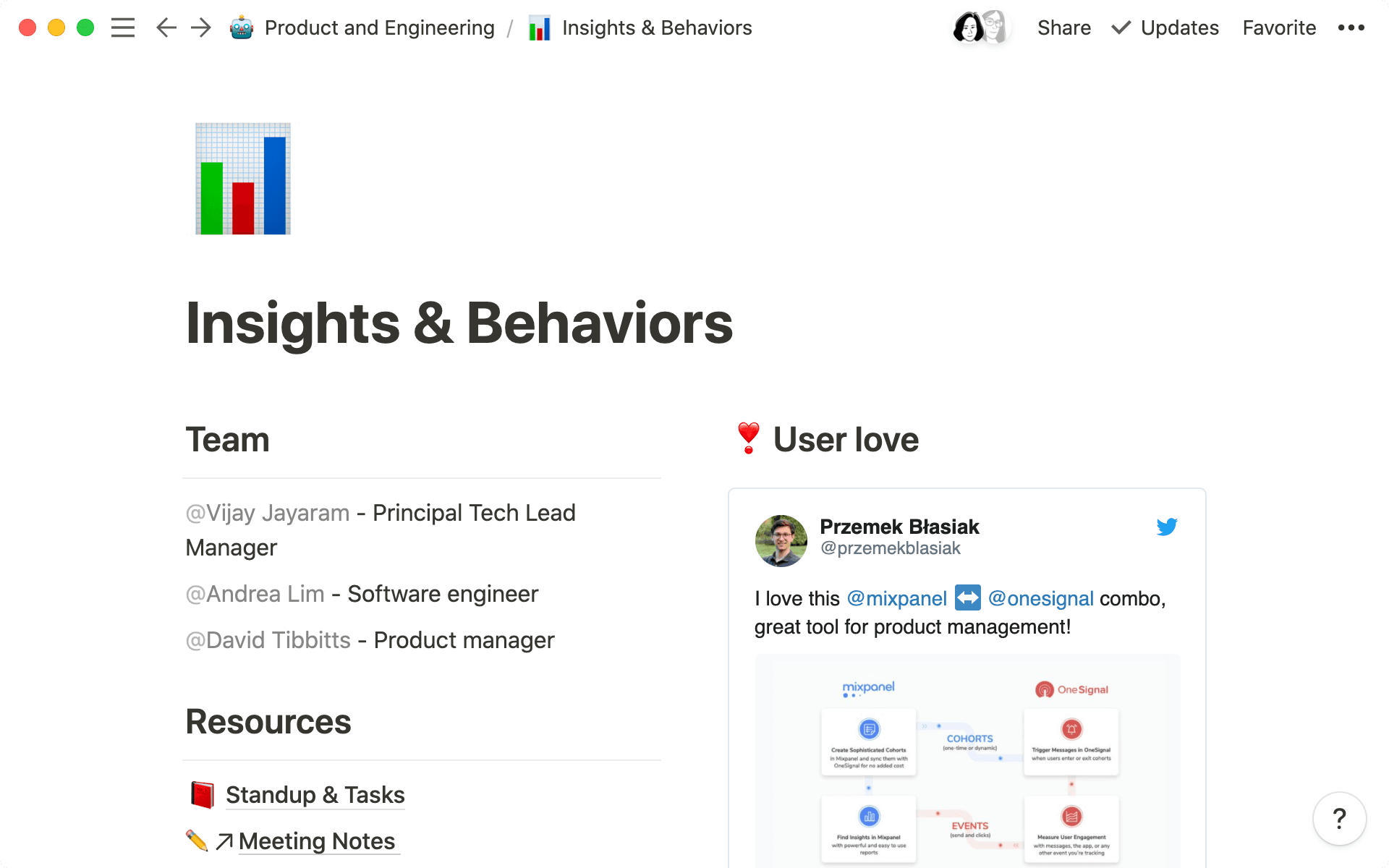 With so many projects and meetings to organize, Vijay keeps his team focused with a Notion homepage. It displays everything important to them — feedback directly from users, a filtered view of the roadmap with just their projects, key process documents, and a team directory. His colleagues can visit the page to get an aerial view of everything that's going on with the team.