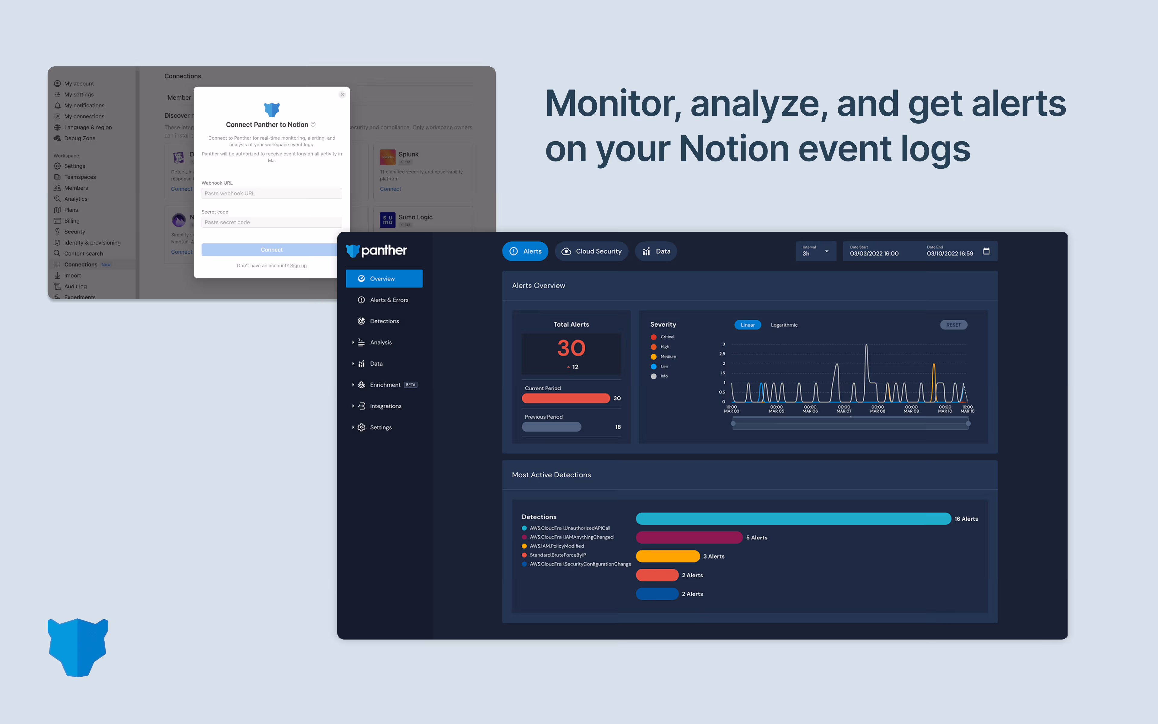 Panther monitors your environment through log ingestion and real-time monitoring. With this integration, you can start ingesting your Notion audit/activity logs to Panther with a couple of clicks and seamlessly start monitoring your Notion environment using Panther’s out of the box detection pack. Out of the box detections keep your security team in the loop if anything suspicious happens, like unusual login activity, data exfiltration, admin changes, and more. If Panther detects a potential threat like these in your Notion logs, your security team receives an alert, enabling them to easily investigate related activity with Panther’s fast search tools and ensure Notion remains secure.